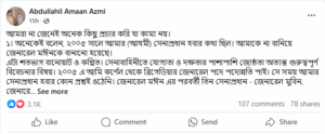 পোস্টে আজমী বলেন, “আমরা না জেনেই অনেক কিছু প্রচার করি, যা কাম্য নয়। অনেকেই বলেন—২০০৫ সালে আমার সেনাপ্রধান হওয়ার কথা ছিল। আমাকে বাদ দিয়ে জেনারেল মঈনকে ওই পদে বসানো হয়। কিন্তু এই কথাগুলো শতভাগ বানোয়াট ও কল্পিত। কারণ সেনাবাহিনীতে পদোন্নতির ক্ষেত্রে যোগ্যতা, দক্ষতা এবং জ্যেষ্ঠতা—এই তিনটি বিষয় গুরুত্বপূর্ণ ভূমিকা রাখে।”
